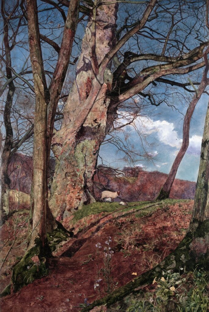 Our eyes are drawn to the little details of the flowers, of the gnarled and perhaps gnawed bark on the trees, of the wispy grass in the foreground,  because of the intense realism of Inchbold’s image, which seems almost photographic in quality. The painter was profoundly influenced by the Pre-Raphaelite movement, and its primary promoter, the art critic John Ruskin. Ruskin urged artists to recover the ‘innocent eye’ of the medieval artist, to depict what they saw before them without attempting to re-order it according to the rules of ‘Great Art’, the traditions explained for young British artists in Joshua Reynolds’ Discourses on Art (1769-90). Pre-Raphaelite artists created images in which there was no clear central focus, in which every part of the image was depicted in equally faithful detail, and in which colours were not blended tastefully, but painted in all their bright diversity. Although Ruskin himself eventually lost his childhood Evangelical faith, he believed that painters could reveal the mind of God by painting the created world as God himself had shaped and composed it.