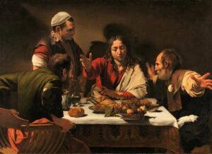 This memorable painting by the Italian artist, Caravaggio, is a vivid depiction of the hospitality shown to Jesus by two disciples after they had walked together from Jerusalem to Emmaus on the evening of the first Easter Day. The painting shows the very moment when the disciples recognised their travelling companion was, indeed, Jesus, resurrected from the dead. As St Luke recorded in Lule 24:30-31 it was when Jesus blessed the food in his familiar way that ‘their eyes were opened, and they knew him’.